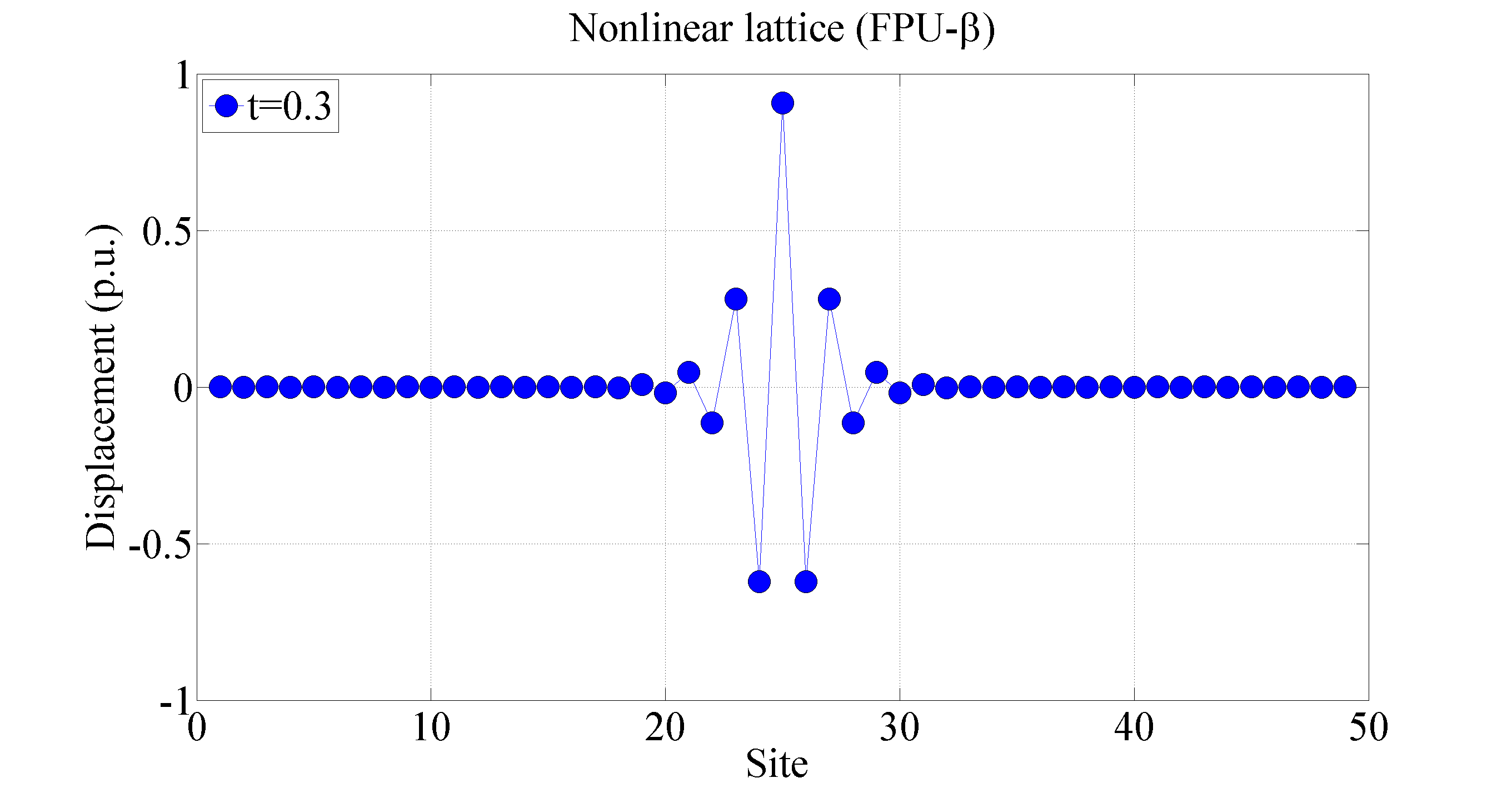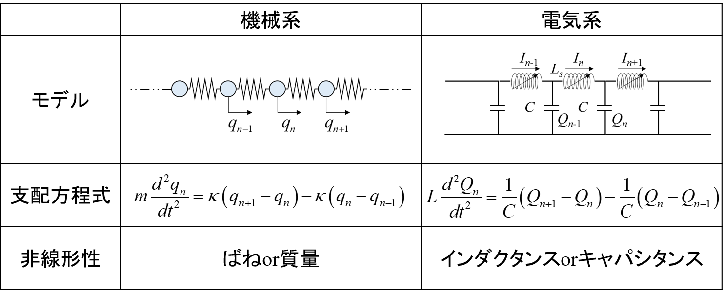 多数の質点と非線形なばねを結合した力学系において,非線形局在モードと呼ばれる特殊な振動モードが生じることが固体物理学の分野で発見されました.