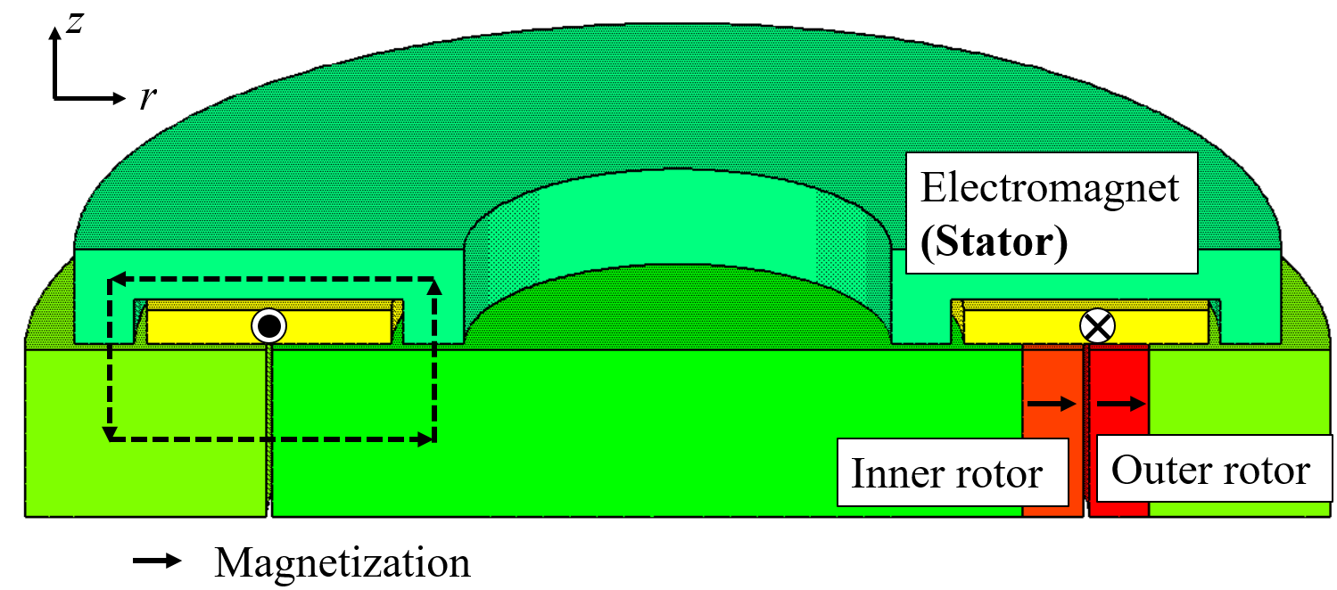 異なる周波数応答特性を得る広帯域化法を研究しています.特に,永電磁石と呼ばれる,可変特性磁石を内包した特殊な電磁石を活用するのが特長です.
