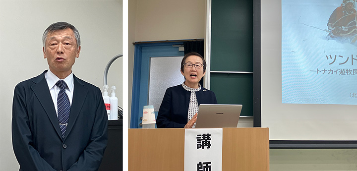 講演ではまず「何万年もかけて極地に到達したコリャークが、どのように厳しい自然環境に適応してきたかを、主たる動物資源であるトナカイを<捨てない側面>と<捨てる側面>から考える」と趣旨を述べられました。