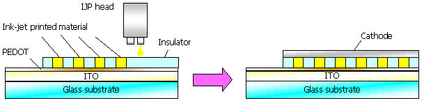ここで、これまで開発されてきたIJP法による有機EL素子作製では、パターニングによる隔壁(バンク)形成と高精度のインク吐出による位置合わせが必要でしたが、我々は、簡単・高歩留まりにデバイス作製可能な自己整合IJP有機EL素子を提案・実現してきました。 自己整合とは、自動的な位置合わせ形成方法であり、下図に概略図を示します。 透明電極付きガラス基板に絶縁膜を形成し、IJP法で有機発光材料を吐出します。 吐出されたインクの溶媒で絶縁膜を溶解し、乾燥過程で発光部が形成されます。 周辺部はデバイスのバンクとなります。実際に、これまで作製した有機ELパネルを以下に紹介します。