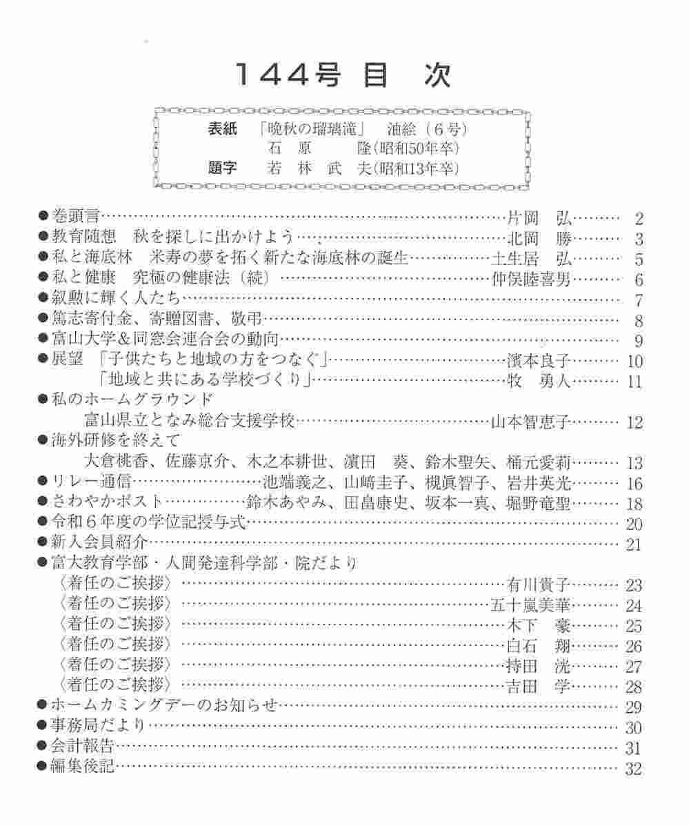 144号・2025年9月発行 ☆目次 表紙「晩秋の瑠璃滝」 石原 隆(昭和50年卒) 会誌の題字は若林武夫(昭和13年卒)です。 |