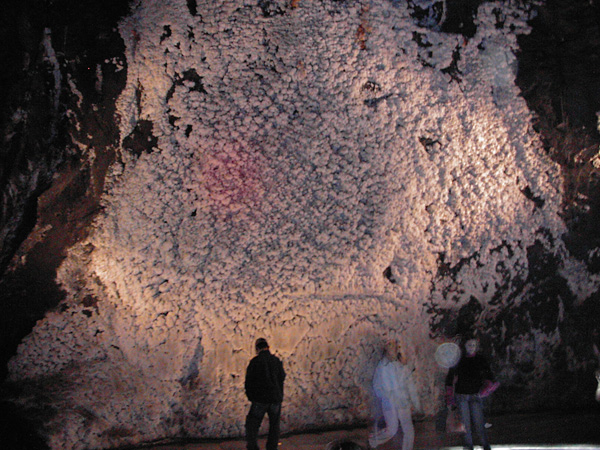 塩の洞窟はこんなふうに大きいのです。すべて塩の壁です。人の大きさと比べるとどれだけ広範囲かわかっていただけると思います。 これで、地底100メートルくらいあります。岩塩はこのようなところか採掘されているということです。