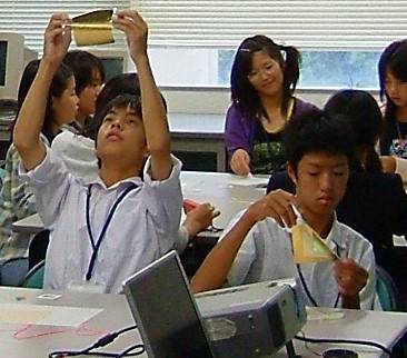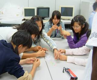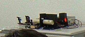 レーザー光を用いた体験実験に移行した。短いビデオを用いてレーザーアブレーションについて学んでもらった。次に、光の速さを測定する実験を行った。レーザーパルスを2つに分け、一方を遠回りさせて遅延させ、その2つのパルスの時間差を測るというものである。生徒達の手で遅延の長さを自由に変えさせ、時間差がどう変わるか調べてもらった。遅延の長さと時間差を計り、光の速さが毎秒3億mほどであることを計算した。その次に、光の速さが水の中ではどうなるのかという問題を出してみた。答を知っている生徒もいたが、実際に光を水の中に通し、水の有り無しで光の速さがどうかわるかを目の当たりに見てもらった。光に関する実験の最後は、光の回折、干渉性に関するもので、ホログラムを用いて行った。まず、格子間隔の異なる2種類の回折格子で光の曲がり方が異なることを確かめてもらった。フレネルホログラムを自然光のもとでみると、回折格子と同様の虹色が見えるだけである。これにミニカーが写っているといわれても誰も信じない。このホログラムにレーザー光を当てて、生徒1人1人に見てもらった。本物のミニカーそっくりに見えることを、生徒達は体の位置を変えて面白そうに確認していた。これらは、HeNeレーザーを用いて作成したものであるが、赤色LEDを用いてもある程度像を再現することが出来る。パソコンの光学マウスのLEDが利用できるので、何種類かのホログラムを持ち帰り学校や家庭で鑑賞してもらうことにした。