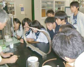 最後に、液体ヘリウムをもちいたカピッツァのクモの実験を行った。これは、光を当てることにより液体ヘリウムが細管から吹き出し、クモの足のような形をしたガラス細工が回転するというものである。これは国内では唯一富山大学で体験できる実験であり、生徒達は光を当てるだけで回転するようすに驚嘆していた。