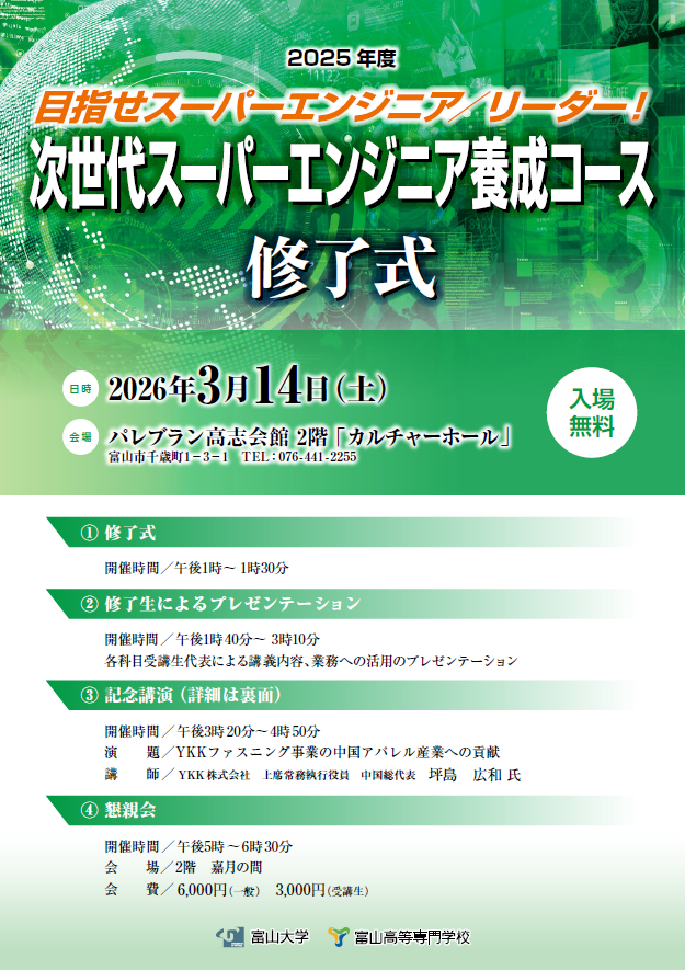 5)所定の単位(10単位以上)を履修した受講生の方には、富山大学(大学院理工学教育部)が修得単位の認定を行い、「スーパーエンジニア」の履修・成績証明書を発行します。