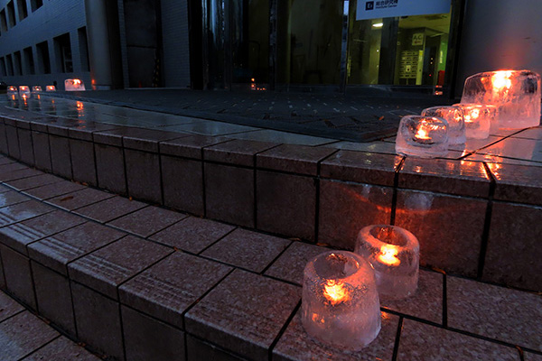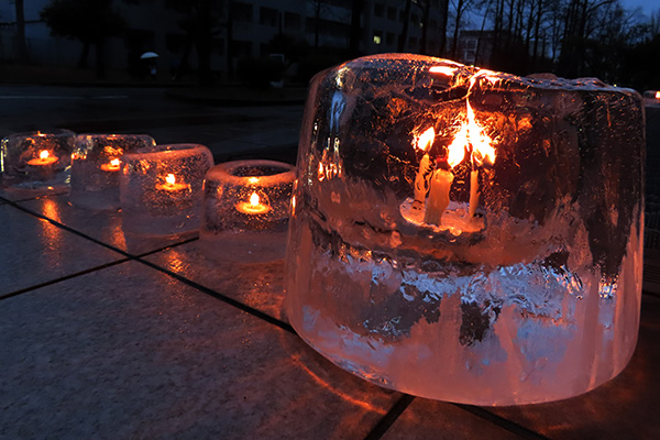 クリスマス・イブの12月24日(水)、理学部正面が優しいキャンドルの灯りに包まれました。 これは、雪や氷の結晶の研究を専門とする理学部の島田 亙准教授が企画・制作したアイスランタンで、この日は夕方4時半ごろから並べられました。聖なる夜に素敵なプレゼントとなりました。