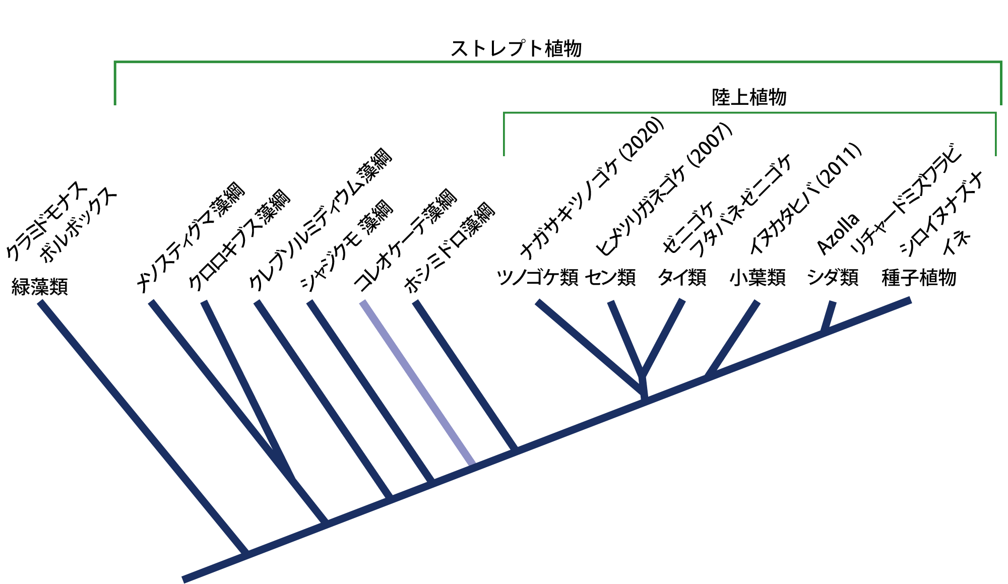 緑色植物はおよそ10億年前に大きく二つのグループにわかれたと考えられており、陸上植物を含む側のグループをストレプト植物と呼びます。ストレプト植物には、陸上植物以外に、ホシミドロ藻綱、コレオケーテ藻綱、シャジクモ藻綱、クレブソルミディム藻綱、メソスティグマ藻綱、クロロキブス藻綱の6つのグループが認識されています(図1)。今世紀に入って多様な生物のゲノム解読が進みました。植物ではシロイヌナズナ・イネなどの被子植物のモデル植物から解析が進められましたが、続いて陸上植物の進化に興味を持ち、陸上植物の進化の初期に被子植物と別れたグループ、コケ植物セン類のヒメツリガネゴケ(1)や小葉類のイヌカタヒバ(2)のゲノムを解析して、被子植物の発生に関わる遺伝子の多くが陸上植物の初期にすでにあったことが明らかになりました。さらに、ここ10数年の間にコレオケーテ藻綱以外の全てのグループについて1種類以上の生物についてゲノムが出版されました。このうち私たちは、シャジクモ(3)およびヒメミカヅキモ(4)のゲノム解析に貢献しました。