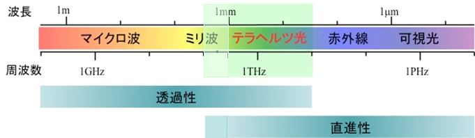 テラヘルツ光(周波数 0.1~10 THz、波長3 mm~30 um)は、電波と可視光それぞれの技術的進展とは対照的に ” 光のフロンティア ” と呼ばれています。この光領域は人間の眼で見えないものを透視することができたり、X線やγ線に比べて被ばくの危険性がないなどの優れた特長をもっているため、これらを活かしたセキュリティー応用やメディカル診断、天文観測や物性研究など、様々な分野でのテラヘル ツ光応用の可能性を秘めています。