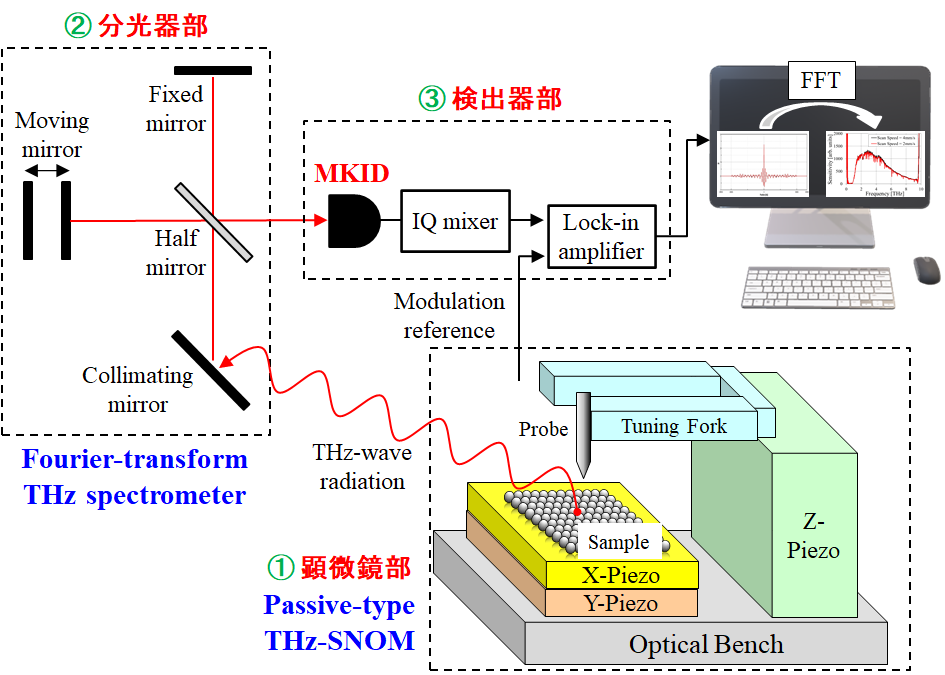 本研究では、高分子や生体材料などのソフトマテリアルの基礎物性分野に新たな分析手法を提案し確立すべく、テラヘルツ帯で動作する近接場顕微鏡技術(テラヘルツ光ナノスコピー)の創出を目指しています(図2)。具体的には、鋭く尖った金属探針を試料表面に近づけ、その局所から自然放出されたテラヘルツ光をフーリエ変換分光器で変調し、高感度の超伝導センサー(力学インダクタンス検出器)アレイで検出するシステムを構築しています。