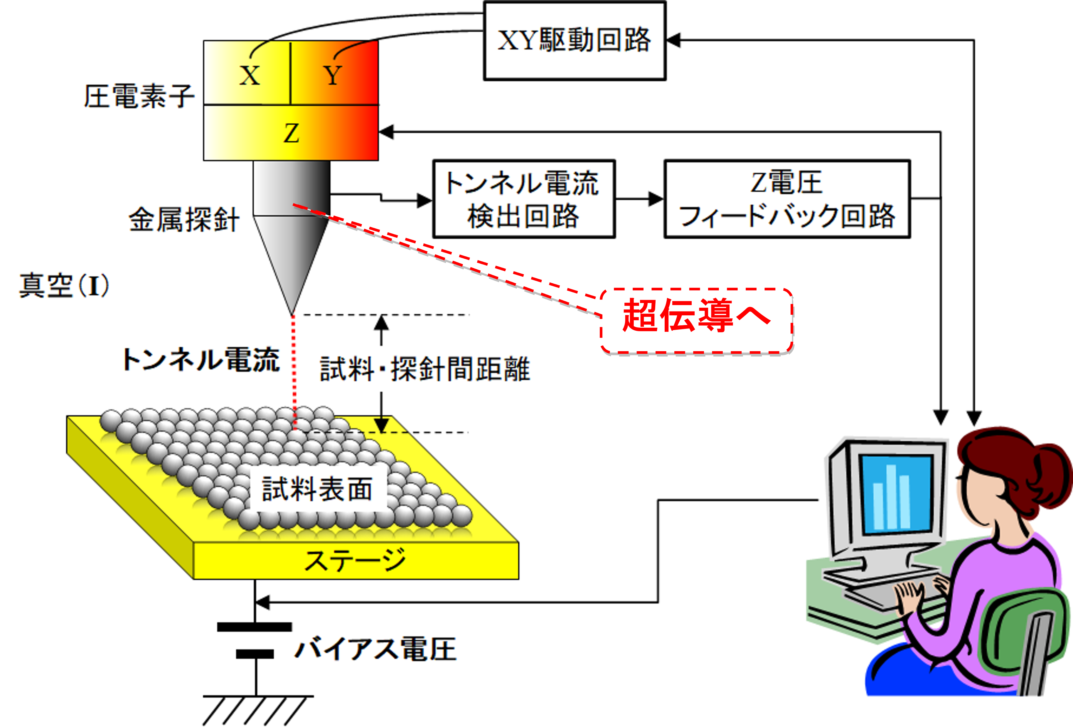 走査トンネル顕微鏡(STM)とは、鋭く尖った探針(プローブ)を導電性試料の表面に近づけ、微小なトンネル電流を検出する装置です(図3)。圧電素子を使ってSTM探針を試料表面の近傍で移動(走査)することで、原子レベルでの電子状態や結晶構造などの直接観察が可能です。しかし、現存のSTM用プローブにはタングステンや白金イリジウムなどの常伝導金属が使用され、未知の試料表面を観察するといった研究が主流であり、「探針そのものを超伝導化すればどのような新たな知見が得られるのか?」という着眼点に立った研究は未開拓です。そこで本研究では、従来の常伝導プローブに換わり、高温超伝導体(YBCO)を用いたプローブの創製を目指しています。