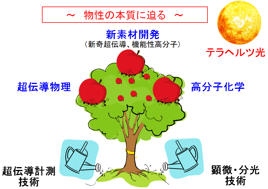 当研究室の目指すもの(図1)は、テラヘルツ光という暖かな日差しのもと、超伝導と顕微分光の融合によって新たなナノ計測技術を確立し、超伝導物理や高分子化学等の基礎科学研究のみならず、新素材開発(新奇超伝導や機能性高分子)などの応用研究により、ナノスケールの観点から物性の本質に迫ることです。