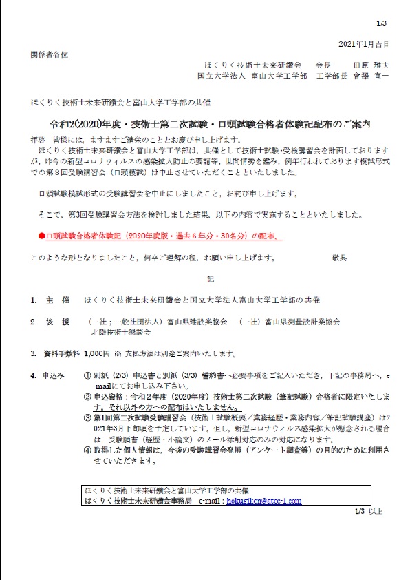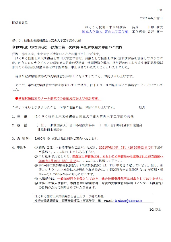 ほくりく技術士未来研鑽会と富山大学工学部は,共催として技術士試験・受検講習会を計画しておりますが,昨今のコロナウイルスの感染拡大防止の要請等,世間情勢を鑑み,例年行われております筆記試験模試形式での第2回受験講習会は昨年度同様,中止させていただくことといたしました。