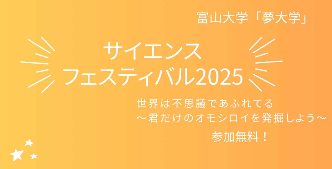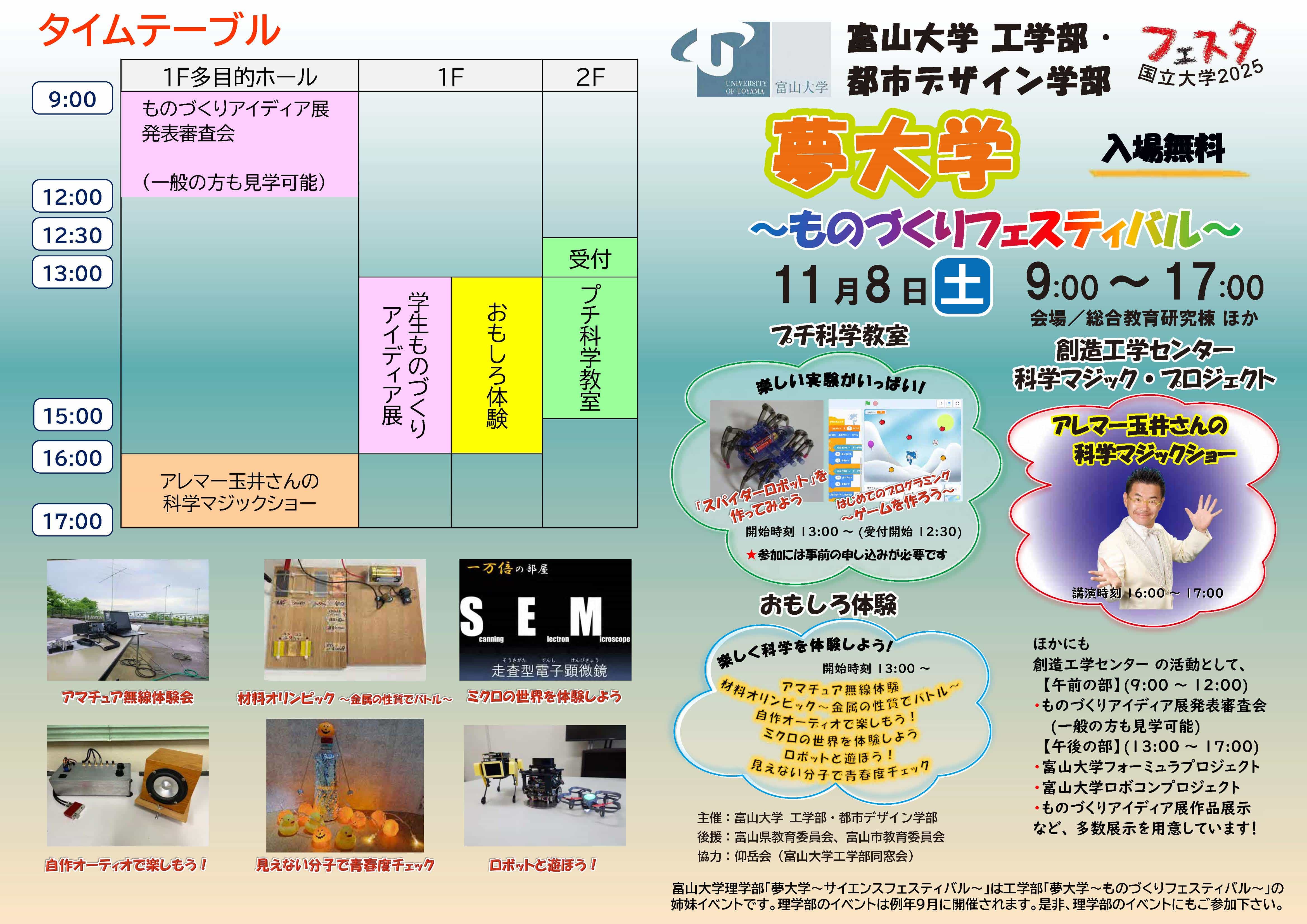 富山大学理学部開催の「夢大学~サイエンスフェスティバル~」は、「夢大学~ものづくりフェスティバル~」の姉妹イベントです。例年9月に開催されているので、来年は、サイエンスフェスティバルにも、是非、ご参加ください。イベント内容は以下のリンクからご確認ください。